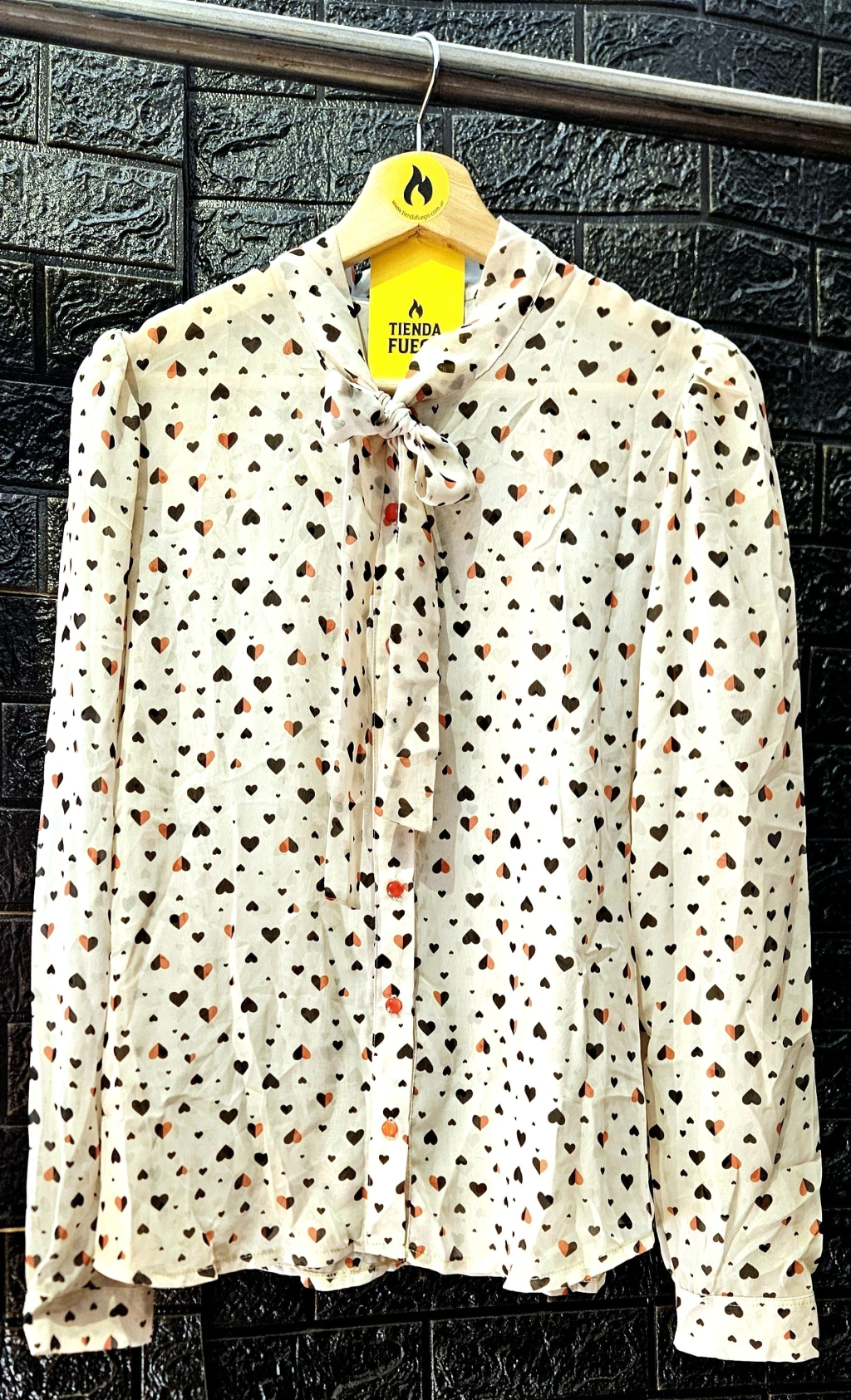 Camisa confeccionada en gasa roja o blanca estampada, con botones al frente y cuello terminado en lazo que se anuda, también en negro crepe liso.