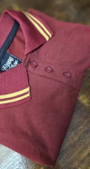 La chomba mostaza está confeccionada en algodón peinado, con los detalles de ribb negro.