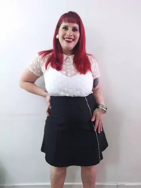 Falda de corte evasé, tiro alto, confeccionada en bengalina elastizada con cierre metálico al frente irregular.