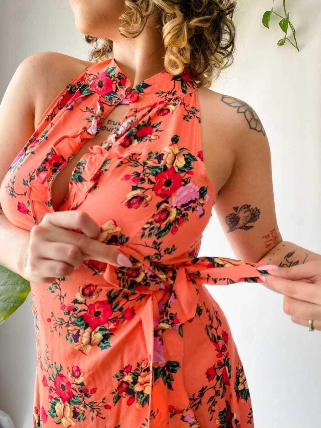 Vestido portafolio de fibrana estampada. Tiene cuello halter con un botón a contratono y un escote gota con volados. Su silueta es acampanada y termina cerca de las rodillas con volados que generan movimiento.